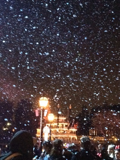 The savvy people who run Disneyland must understand that novelty for an Angeleno like me.  When I was there one evening around last Christmas, they had a machine generate gentle snowfall over a crowd of us gathered near Tom Sawyer Island – and I was figuratively and even a bit literally tickled!
