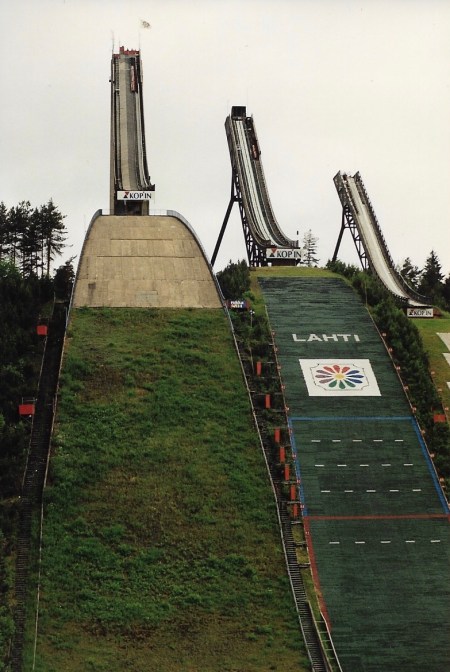 While visiting Lahti, I took a similar lift up their ski jump (which was all serene and snowless in the summertime).  Standing way at the top, I thought of the fortitude one would have to summon to attempt this sport! I imagined coarse winter winds stinging my face as I started down the icy track, skis chattering as I maintained a straight line and then surged off the end of the platform, soaring into the sky in defiant challenge of gravity and the elements – jumping to free my soul!