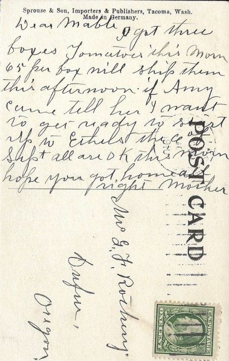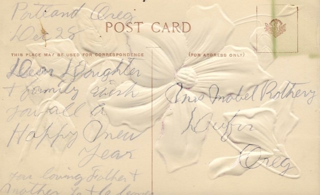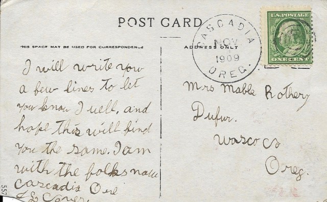 Several branches of my family were among those who traveled west for gold or a homestead. At times, members of the Oregon branch lived only a matter of miles apart – yet postcards saved by my great-grandmother Mabel Cover Rothery show that, even in an era when car travel and party phone lines were becoming viable ways to stay in touch, the family still spanned the distance between them by dropping a line in the mail.