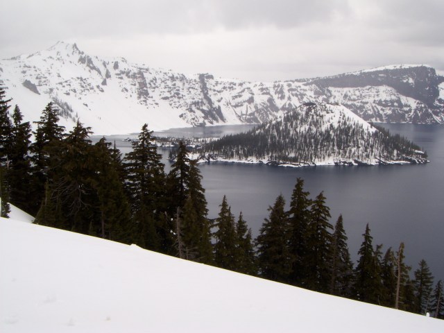 I flew over this volcanic remnant of former Mt. Mazama each summer en route to the Shakespeare Festival in nearby Ashland, but it was years before I finally got a close-up look one May while it was still blanketed with snow.  At last, the spot I’d only gotten a kind of flat impression of from far above now took on dimension and depth – the deepest depth for a lake in the US as a matter of fact!
