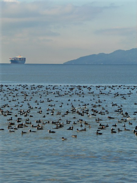 Strolling English Bay where a ship awaits its turn to enter the harbor.