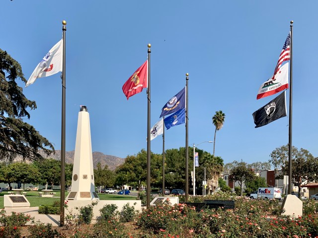 Like in McCambridge Park here in Burbank! It’s a city block full of lawns and facilities for activities like swimming, softball and (in more carefree days) picnicking and partying. But a few weekends ago, I was looking for something else – a rose-adorned corner of the park set aside as a dedication to veterans: