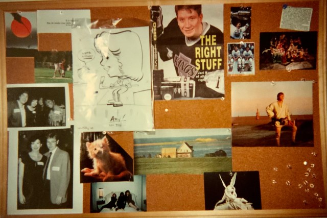 During some house cleaning I couldn’t manage to avoid, I finally did turn up a hint of Star Wars from my past! (But I’m keeping Grogu anyway.) It’s hidden in this fuzzy photo of a bulletin board that I filled up in the mid-90’s with things that mattered to me at the time: