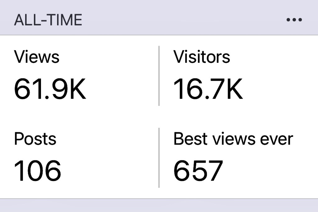 The number of views of all my posts! Even figuring that half of these hits are attributable to me or Mum, I still think it’s a pretty good figure!