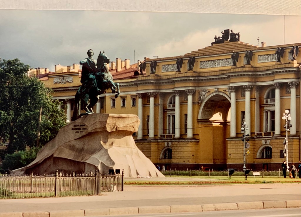 “Well, over there in Senate Square is a statue of Peter the Great known as the Bronze Horseman.”