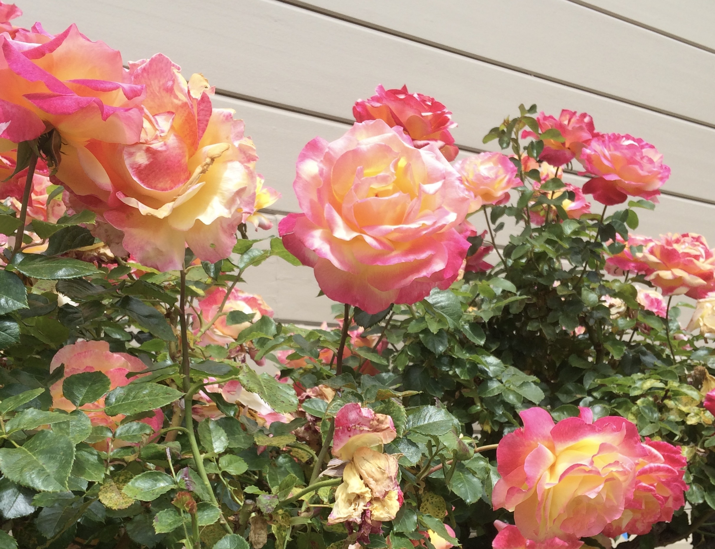 Mum and I were out doing this when that first rose caught our eye. After that we started seeing them on just about every block! And next, I was noticing how they adorned fences and pathways outside all kinds of homes between my place and Mum’s – even right across the street from my apartment where I’d been pulling in and out every day and hadn’t seen that they’d appeared. So now while watching the road, of course, I also enjoy keeping a lookout for pretty roses as I drive along!