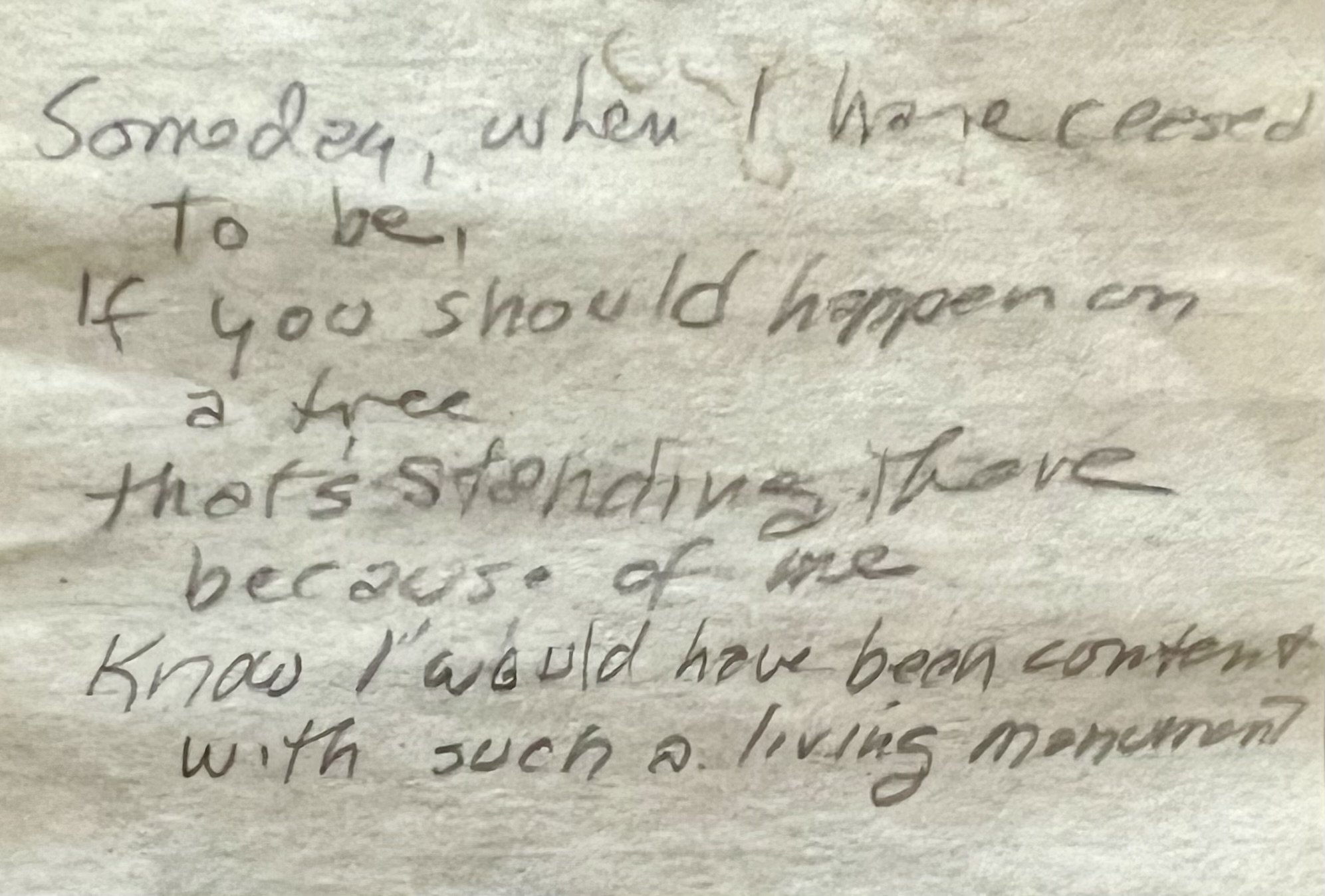Yes, I do think I’m predisposed to favoring the company of trees. I got to spend so much quality time among them as a kid – plus, maybe a nature-loving gene is just part of my family’s own “tree”! Dad had many interests, but he decided his calling was to work first for the Forest Service, and then as a Plant Pathology professor. So basically, he was a tree doctor! I don’t know where Dad came across this sentiment (or if it’s original) – but it’s in his own handwriting and kinda sums things up: