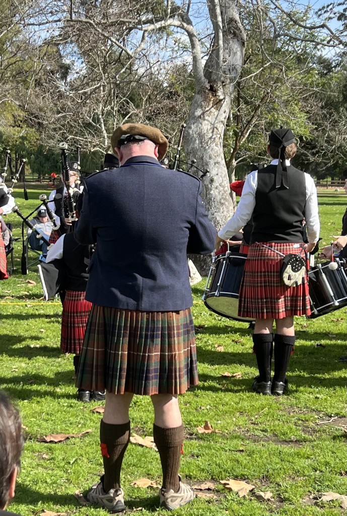 But I was still thinking of a recent Saturday which I began by happily gazing out the window at a brief sunny break between successive So-Cal storms. I didn’t feel super ambitious, but I resolved to disrupt a forming pattern of solitary, homebound living by involving myself in something. I’d read there was a thing called “Pipes in the Park” going on nearby, so I dug up my Clan Gunn tam and headed out – not at all sure what I’d find.