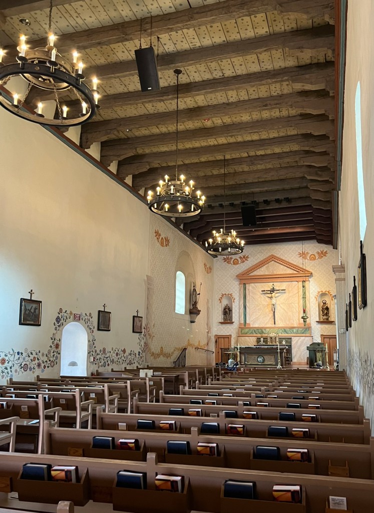 This one (another founded by Father Serra, himself) is now hemmed in by the town of San Luis Obispo – but inside the church with its magnificent timbers and brightly painted walls, it’s easy to feel transported to older times. While that long, thin design is now familiar to me, I discovered this church is unique for having a second nave running off to the right of the altar (where a practicing choir added atmosphere to my visit!). And I sure wasn’t surprised to see that the mission is well covered in the bell department: