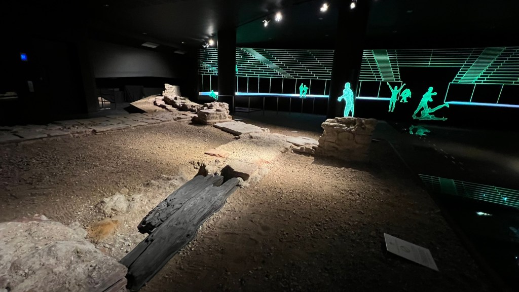 I really enjoyed the gallery’s impressive collection of artwork! But I was also anxious to make my way downstairs to where now, resting in eery quiet, are remains of the amphitheater rediscovered in 1988 during building renovations. While not on the scale of Rome’s Coliseum, they offer an intimate local example of a bygone and brutal day: