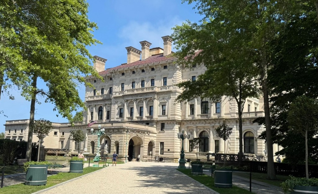 The Breakers is among a number of grand mansions which don’t so much dot the Newport coastline as put opulent exclamation points along it! It was once a summertime getaway (hence, the term “cottage”) for the Vanderbilt family – but now, common riffraff like myself can tour it for a dazzling dose of the Gilded Age! That’s the era between something like 1870 and 1900 when American society was careening into industrialization – when some rose to amazing heights of wealth, and many more were ground down. The term “Gilded Age” comes from the novel by Mark Twain and Charles Dudley Warner, and suggests that an appealing outer layer of gold may actually cover some dreadful societal flaws…