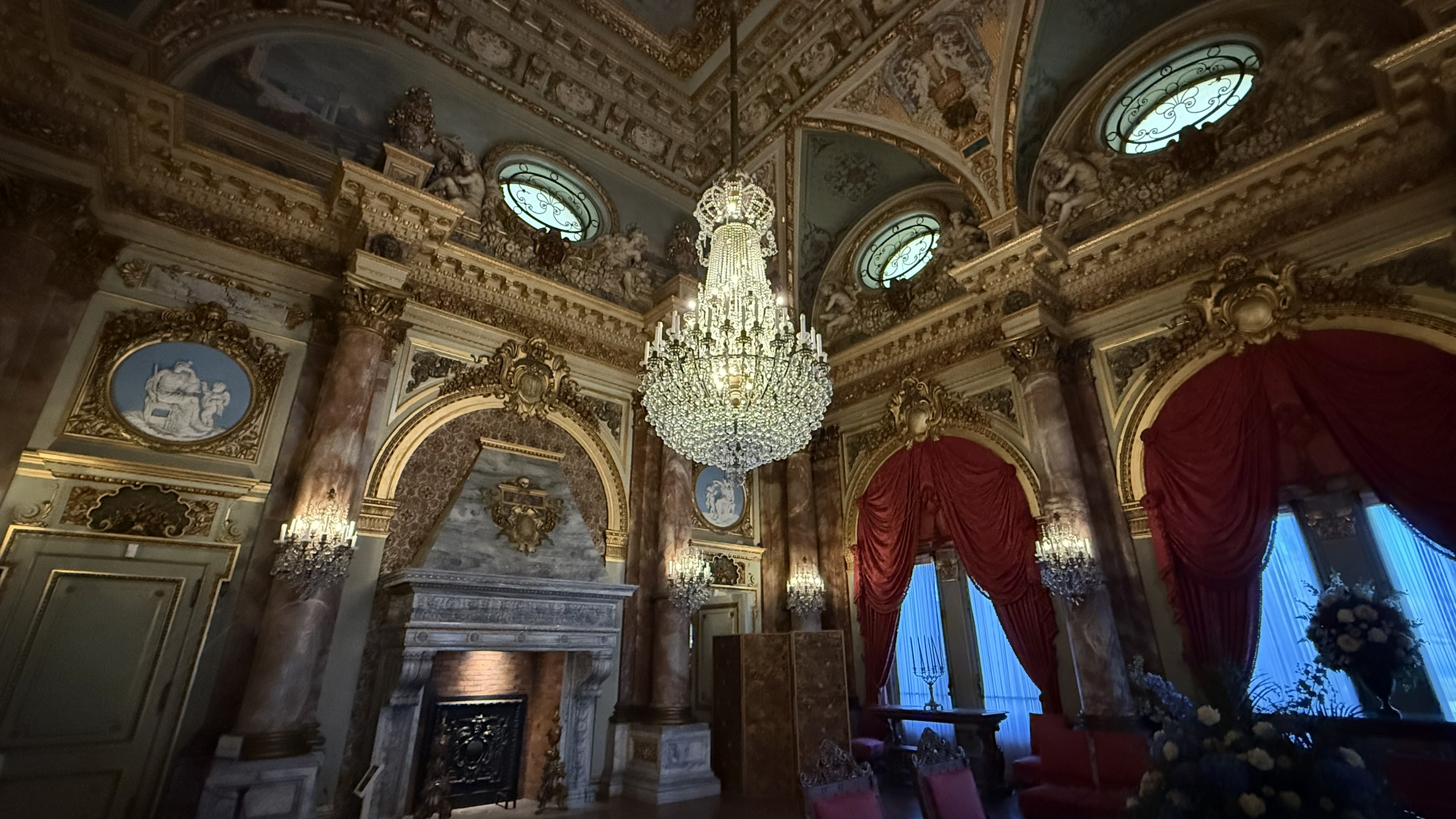 The Breakers is among a number of grand mansions which don’t so much dot the Newport coastline as put opulent exclamation points along it! It was once a summertime getaway (hence, the term “cottage”) for the Vanderbilt family – but now, common riffraff like myself can tour it for a dazzling dose of the Gilded Age! That’s the era between something like 1870 and 1900 when American society was careening into industrialization – when some rose to amazing heights of wealth, and many more were ground down. The term “Gilded Age” comes from the novel by Mark Twain and Charles Dudley Warner, and suggests that an appealing outer layer of gold may actually cover some dreadful societal flaws…