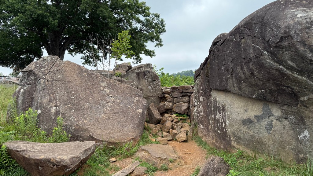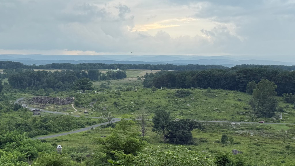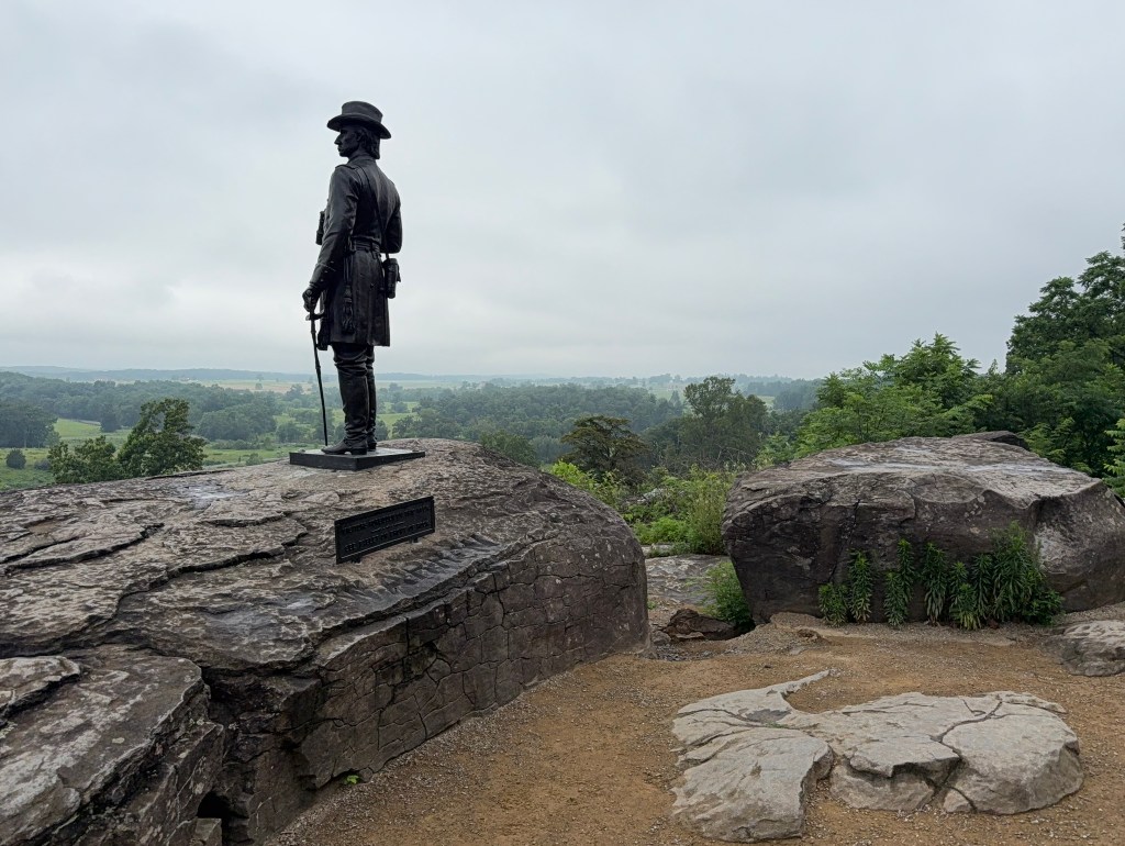 This was part of a ridge where on the second day of fighting, a Union Chief of Engineers named General G.K. Warren recognized the vulnerability of the position and arranged for it to be fortified and defended in the nick time. It seemed like most of us at the talk had some preconceived notions about who the Union heroes of Little Round Top had been. (When I asked the tourist next to me who she thought the biggest hero was, she simply responded “Bayonets!!!” – IYKYK.) But our guide patiently and knowledgeably encouraged us to consider others who played roles in the crucial preservation of that end of the Union line. She wanted us to recognize that throughout those three fateful days, it took the efforts of many courageous men – both well known and less so – to write the battle’s story.
